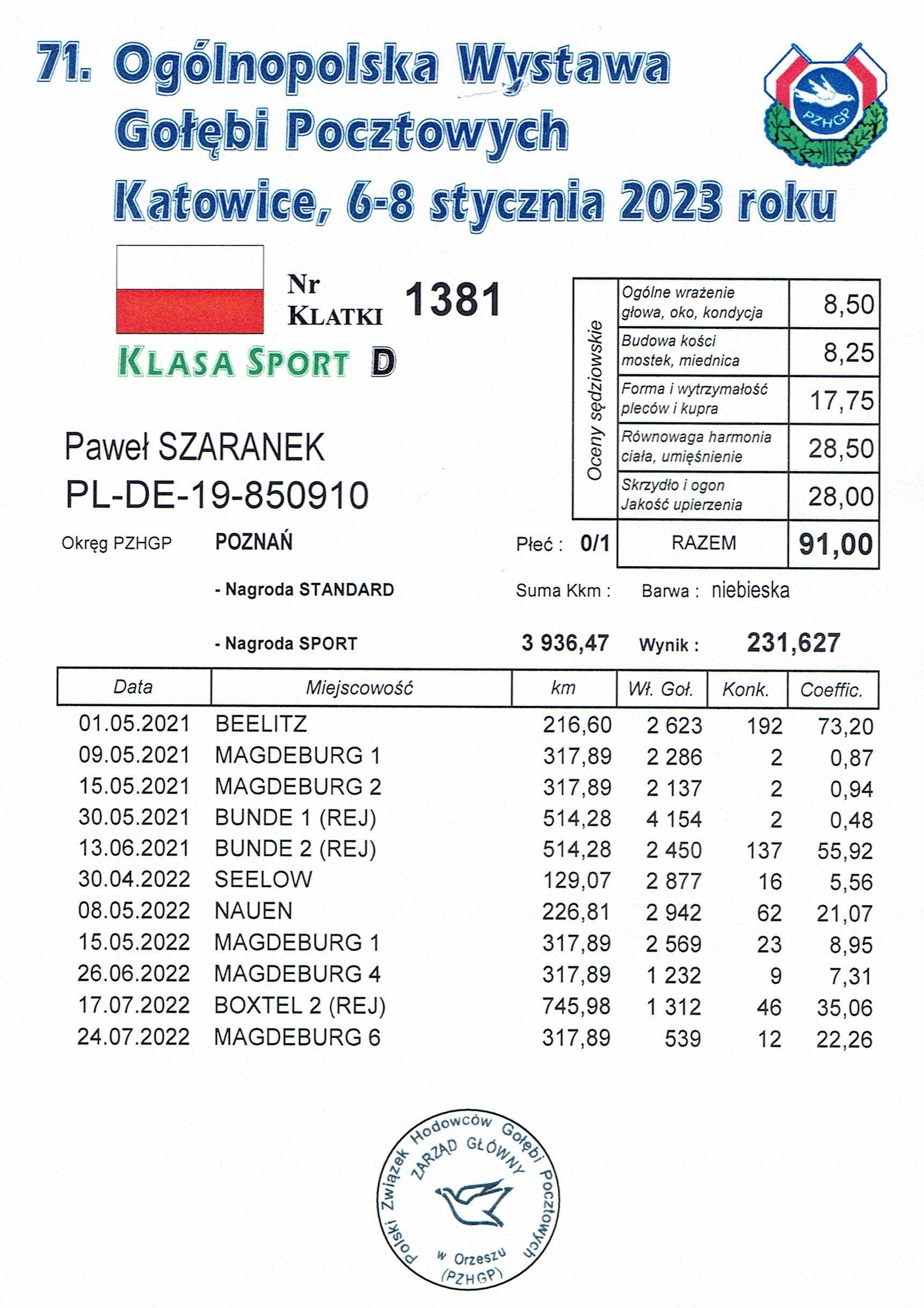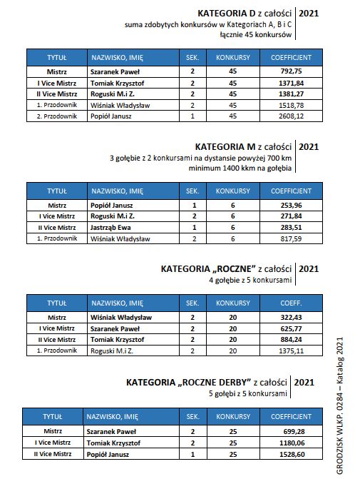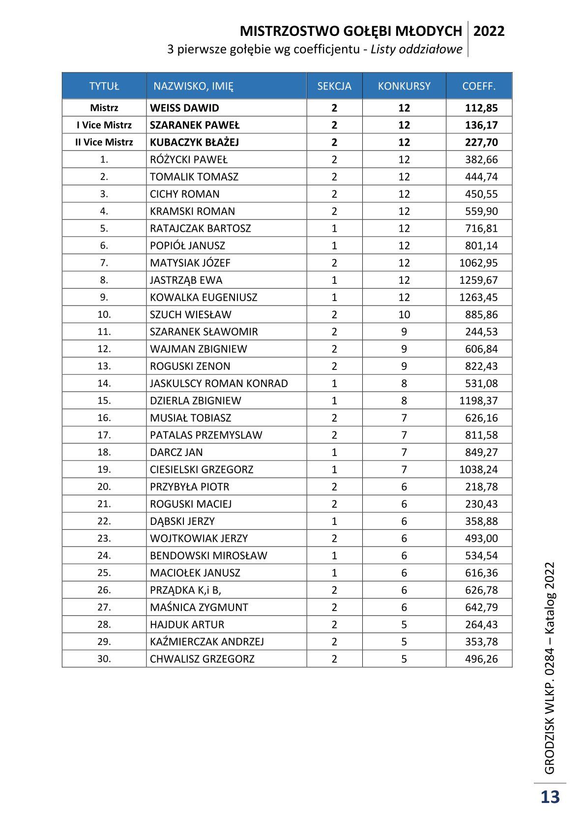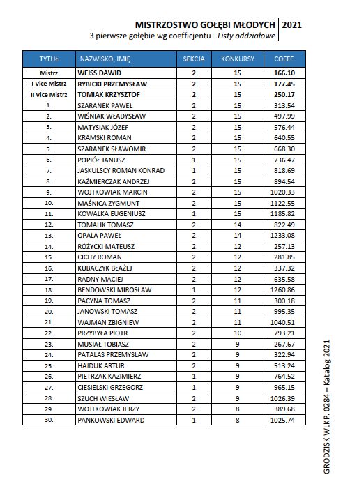 MISTRZ GOŁĘBI ROCZNYCH- 20 KONK./ CEOF. 766,11