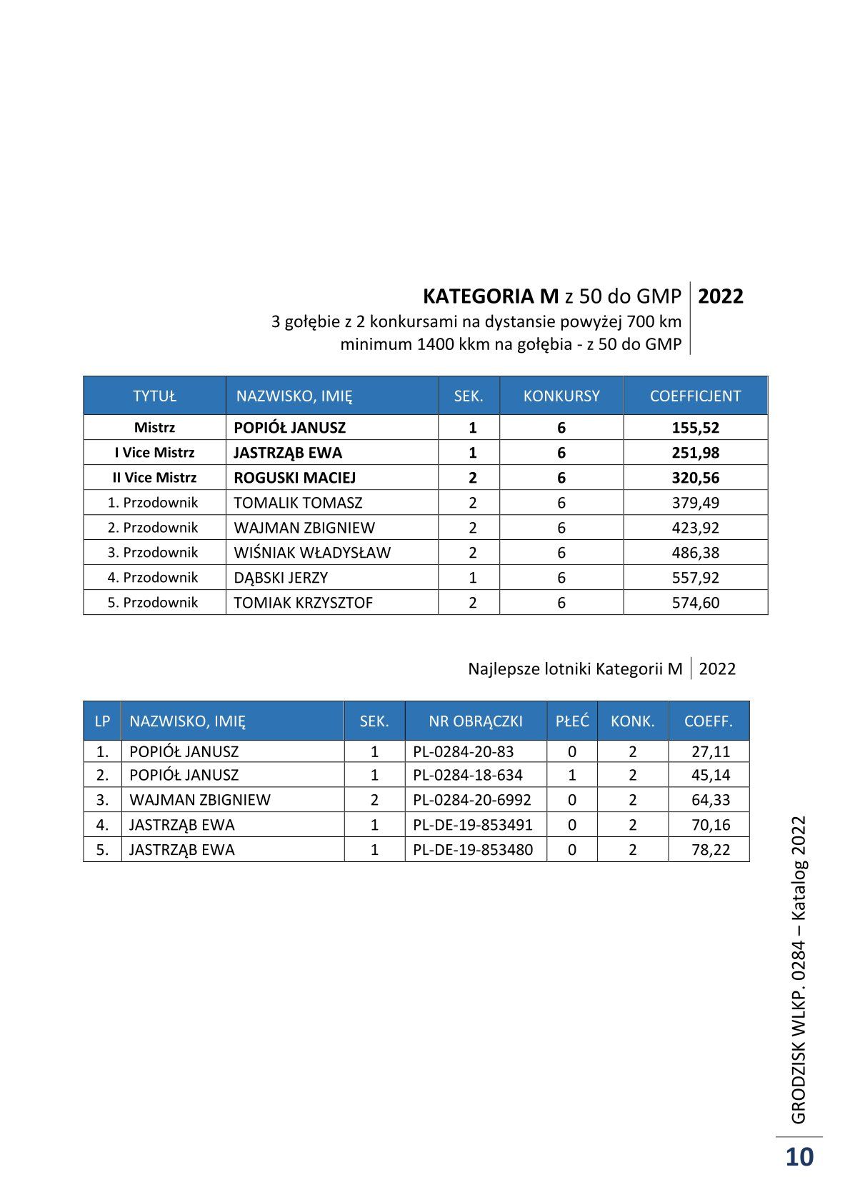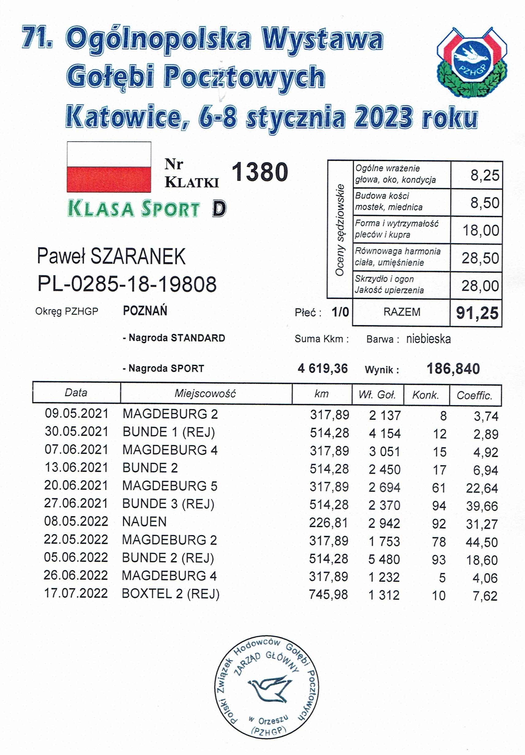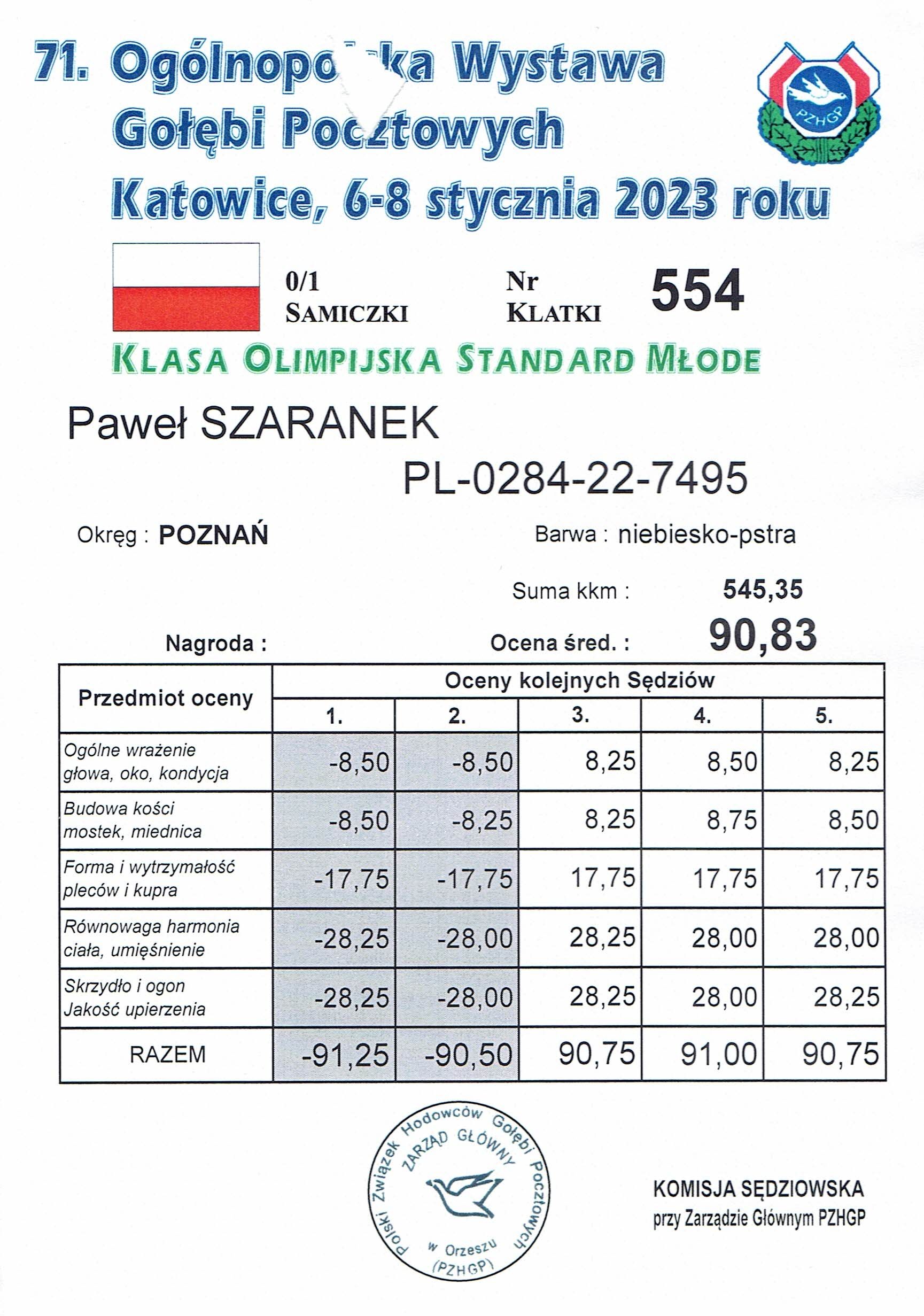 MISTRZ GOŁĘBI ROCZNYCH- 20 KONK./ CEOF. 766,11