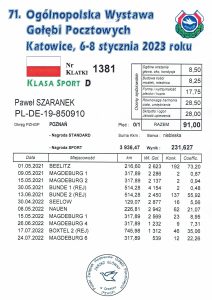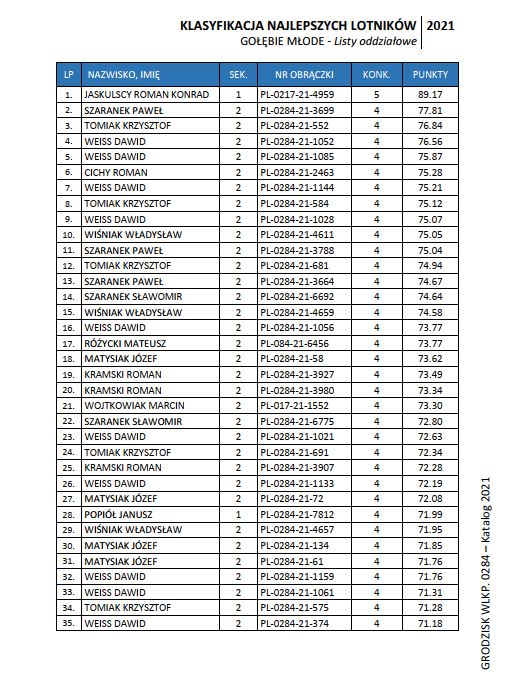 Trzy pierwsze gołębie z listy konkursowej z 4 pierwszych lotów organizowanych przez oddział. O lokacie decyduje