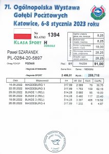 5 gołębie po 3 konkursy na dystansie 300-600km. – minimum 1200 kkm./gołębia