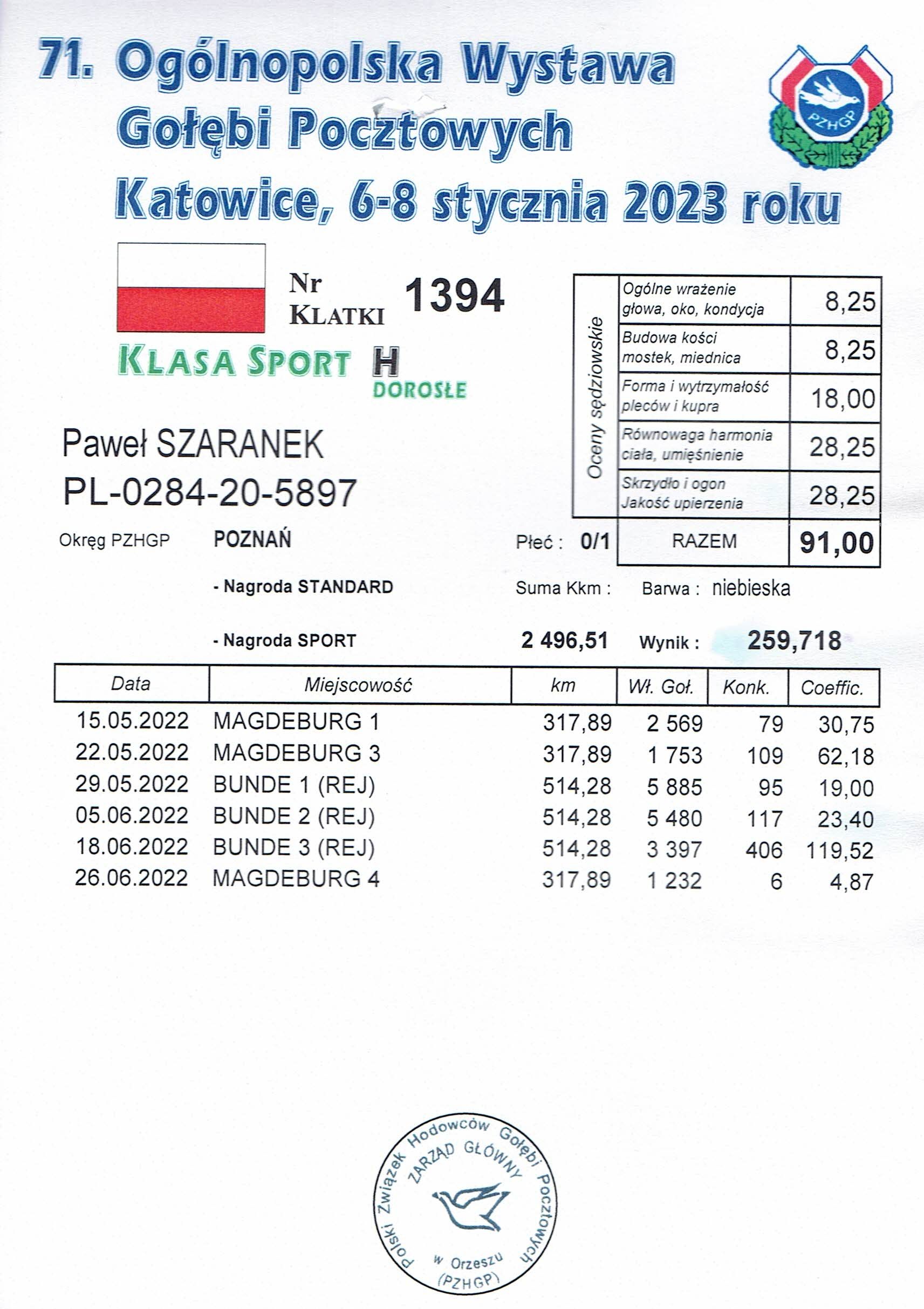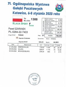 6 gołębie po 3 konkursów na dystansie 100-400km. – minimum 600 kkm./gołębia